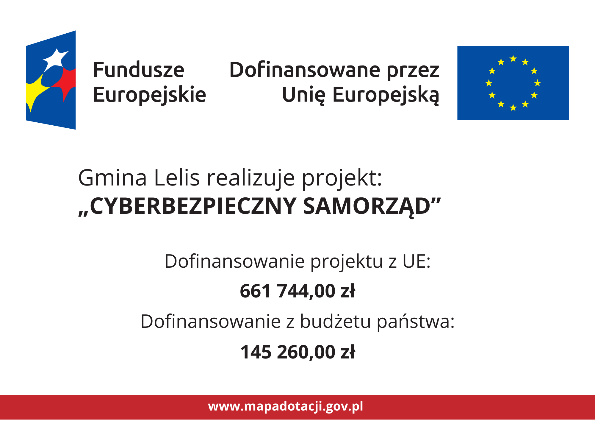 Uzyskany grant w wysokości 807 004,00 zł zostanie przeznaczony na realizację projektu pn. „DOSTOSOWANIE STRUKTURY INFORMATYCZNEJ GMINY LELIS W ZAKRESIE CYBERBEZPIECZEŃSTWA”
